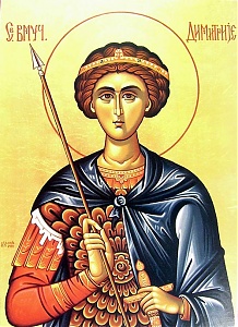 A hagyomány úgy tartja, hogy ez az ortodox egyházban nagy tiszteletnek örvendő katonaszent Szalonikiben szenvedett mártírhalált a diocletianusi keresztényüldözés idején. Kivégzésének oka az volt, hogy föld alatti börtönében megtérítette Nesztor gladiátort, aki az arénában így megerősödve legyőzte a császár kedvenc bajnokát, Lyaeust. A hívek védelmezőjének tekintik, és karddal, pajzzsal ábrázolják.