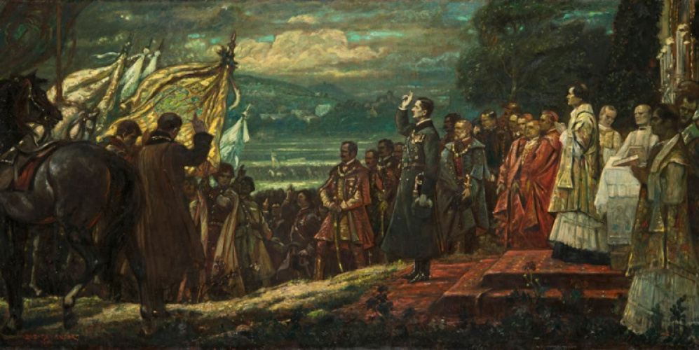 „A trianoni döntés őt is személyesen is érintette, hiszen több alkotása kerül a határon túlra. Az ország integritásának megmentésére törekedő irredenta egyesület, a Védő Ligák Szövetsége pályázatára 1920 nyarán megfestette azt a jelenetet, amikor a nemzeti hadsereg budapesti helyőrsége 1920. április 11-én felesküdött a kormányzó előtt." „A kilenc méter hosszú és három méter magas, bronzfényű rámába zárt kép szerencsés beállításban, sötétbordó drapériákkal díszítve, két oszlop közé helyezetten várja az ünnepi avatást, amely után valószínűleg a történelmi arcképcsarnokban nyer végleges elhelyezést” - írta a Pesti Napló. „Az alkotás a korabeli politikai propaganda egyik kedvelt darabja lett, és a mű számos fontos ember barátságát - és ezen keresztül állami megrendelések sorát - hozta a már ekkor is híres és elismert művésznek." A kép 1945 után eltűnt, így annak csak - a pályázatra benyújtott -színvázlata maradt fenn, a Magyar Nemzeti Galéria őrzi. A kép jobb oldalán a művész saját magát is felfestette.