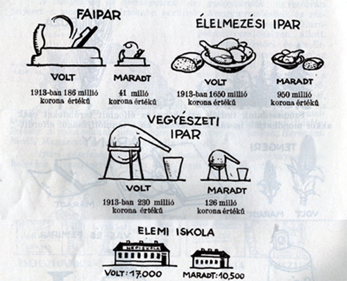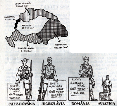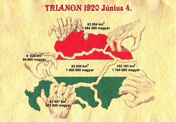 A trianoni békeszerződés eredményeképp Magyarország elveszítette területének több mint kétharmadát. Csak Románia nagyobb területeket kapott - 103 ezer km2-et - mint ami Magyarországnak maradt. Az ország lakóinak száma 18,2 millióról 7,6 millióra esett vissza. Jelentős magyarlakta területeket csatoltak a szomszédos országokhoz. Több mint 3 millió magyar került kisebbségi létbe. Ráadásul ezek mintegy harmada közvetlenül az új határok túloldalán, vagyis az új Magyarország magyarjaitól karnyújtási távolságra. 31 törvényhatósági jogú városunkból elveszítettünk 20-at, a 125 rendezett tanácsú városunkból 93-at. A 12.943 községünkből az elcsatolás után megmaradt 3.413, a magyarországi települések egészéből elvittek 9.643-at és megmaradt csupán 3.456.