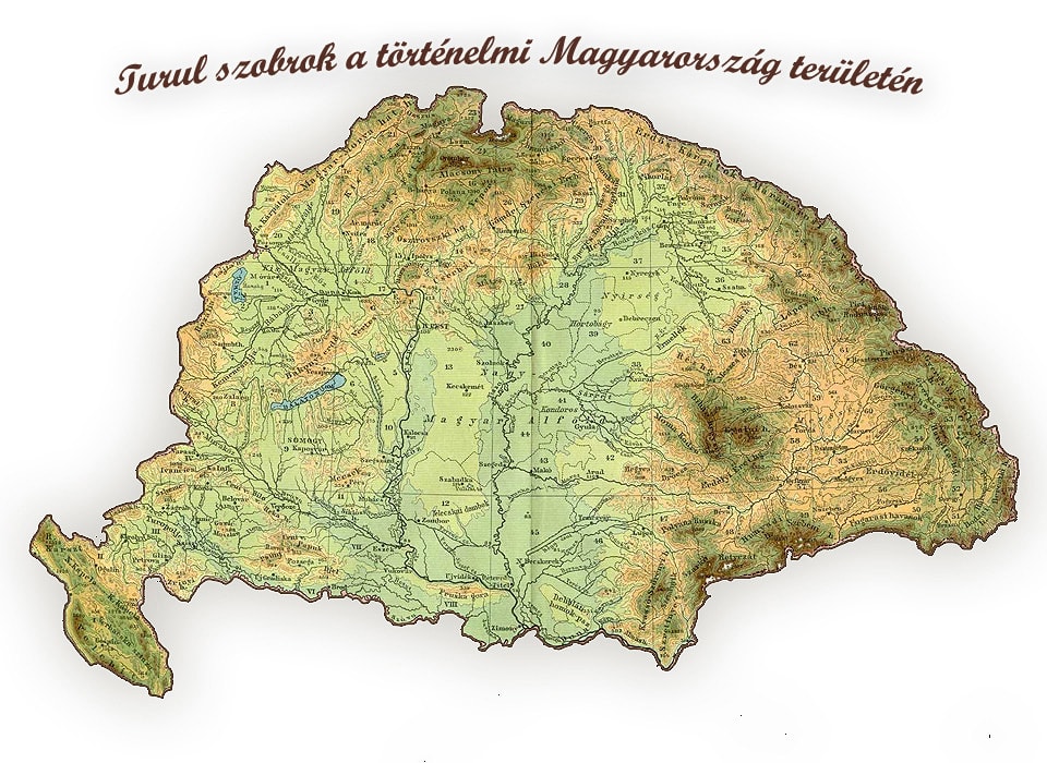 A kattintható térkép a magyarság megmaradását kifejező turulszobrokat mutatja a történelmi Magyarország területén. A piros és fekete pontok azokat a településeket jelölik, ahol legalább egy Turul alkotás található. A piros pontok a ma is létező alkotásokat, míg a feketék a megsemmisített szobrokat mutatják. A térképen a keresett településre kattintva közvetlenül jutunk az adott történelmi emlékműről készült képekhez és a hozzá tartozó leíráshoz. A képek kattintással nagyíthatóak.